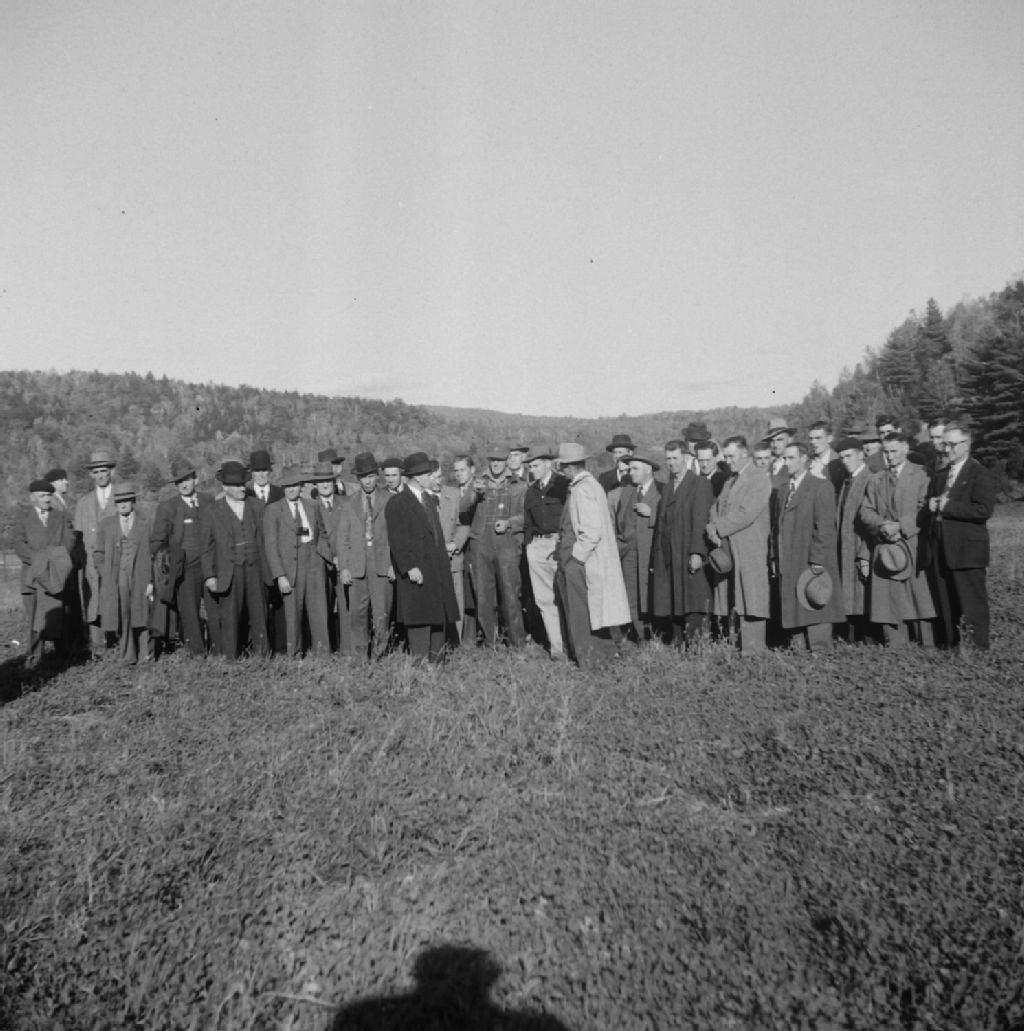 Ferme du Roi herbager de l'État du Vermont pour 1949, monsieur Toune. Un groupe d'agriculteurs québécois visite les installations. Montpellier, Vermont. U.S.A, 1950, Archives nationales à Québec, Fonds Ministère de la Culture et des Communications, (03Q,E6,S7,SS1,D2,P81132), L.J. Boulet.