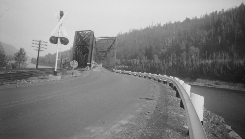 Sortie de la province au pont interprovincial, Saint-Laurent, Matapédia, comté de Bonaventure, 1950, Archives nationales à Québec, Fonds Ministère de la Culture et des Communications, (03Q,E6,S7,SS1,D2,P81156), Jean Bastien.