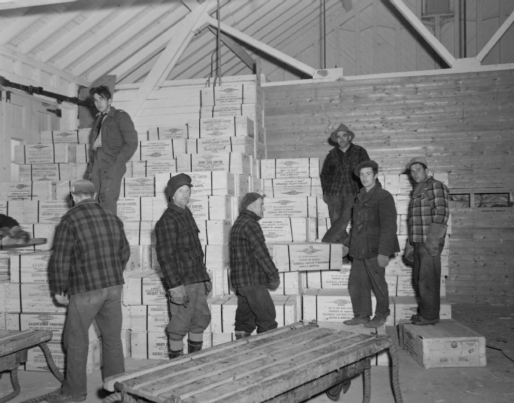 Chargement de la morue sur le SS Capo Vita à destination de l'Italie, Gaspé, 1950, Archives nationales à Québec, Fonds Ministère de la Culture et des Communications, (03Q,E6,S7,SS1,D2,P81519), Gustave Bédard.