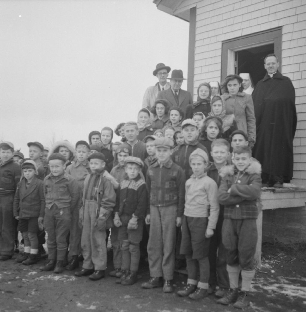 Une partie des écoliers de Laferté avec des visiteurs: le père Lucien Côté, Stanislas Bégin sous-ministre Luc Morin, Laferté, Abitibi-Ouest