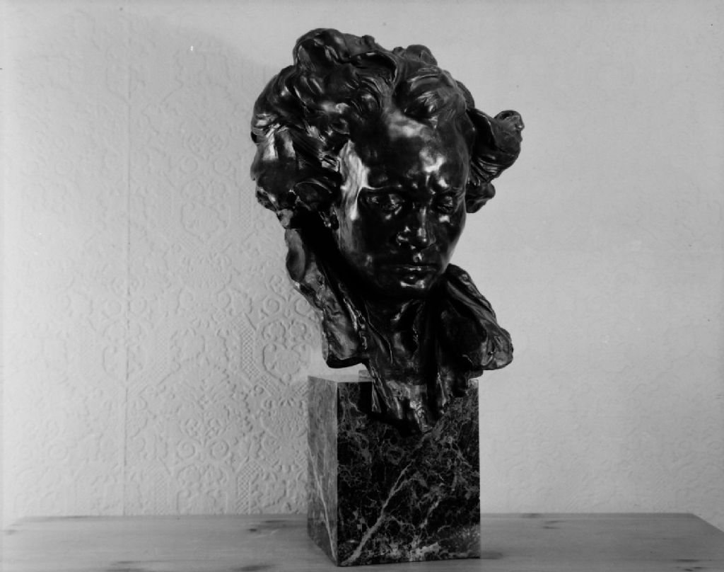 Tête en bronze de Beethoven par Alfred Laliberté au Musée de la province, 1950, Archives nationales à Québec, Fonds Ministère de la Culture et des Communications, (03Q,E6,S7,SS1,D2,P81816), Neuville Bazin.