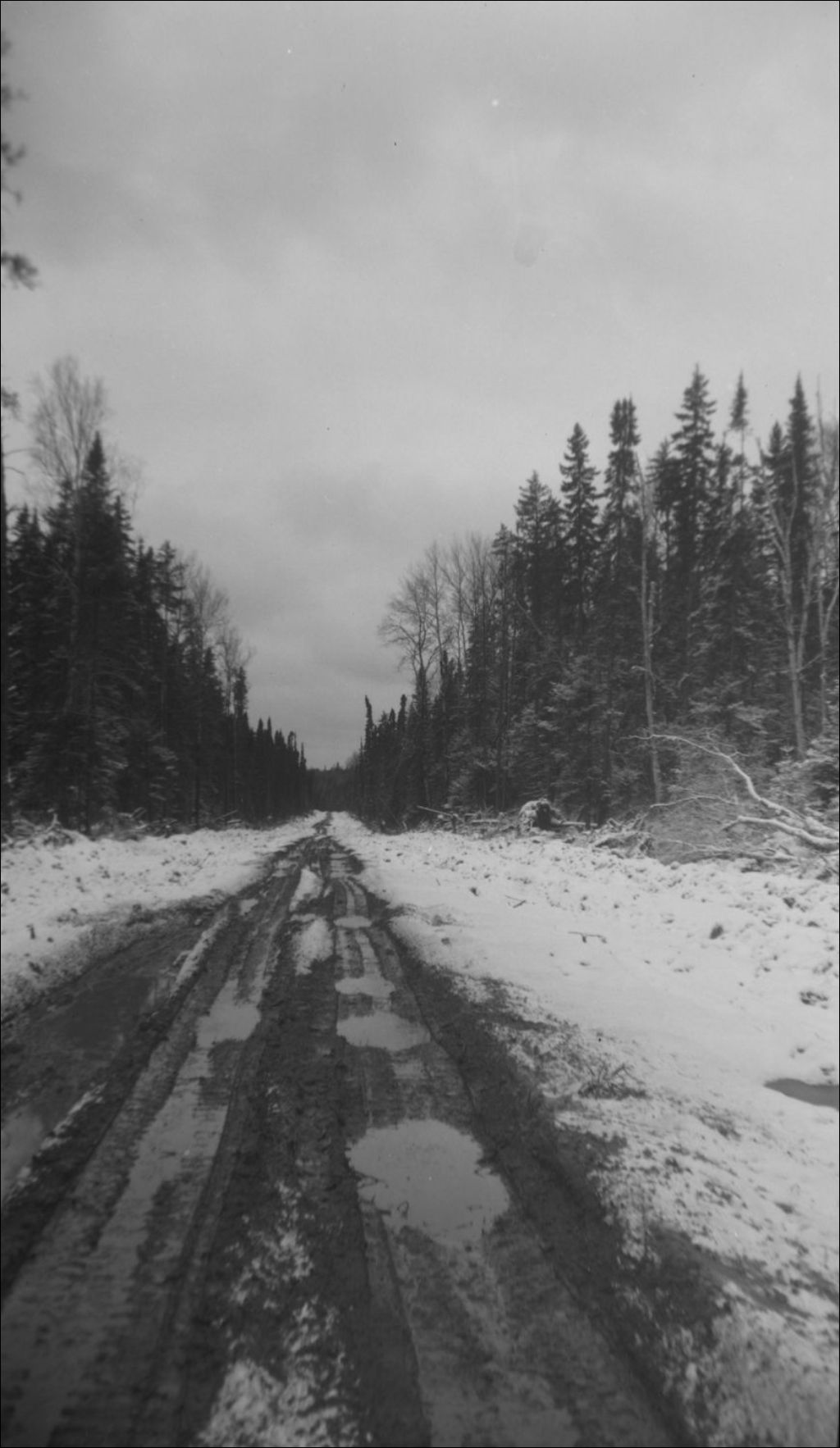 Vue du chemin au millage 23. Chemin Senneterre., 1950, Archives nationales à Québec, Fonds Ministère de la Culture et des Communications, (03Q,E6,S7,SS1,D2,P81929), Serge Godbout.