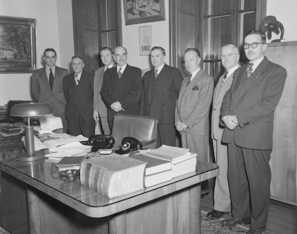 Rencontre du Conseil municipal de St-Jean avec les honorables Premier ministre Duplessis et l'honorable Paul Beaulieu au bureau de l'honorable Maurice Duplessis, 1950, Archives nationales à Québec, Fonds Ministère de la Culture et des Communications, (03Q,E6,S7,SS1,D2,P81955), Neuville Bazin.