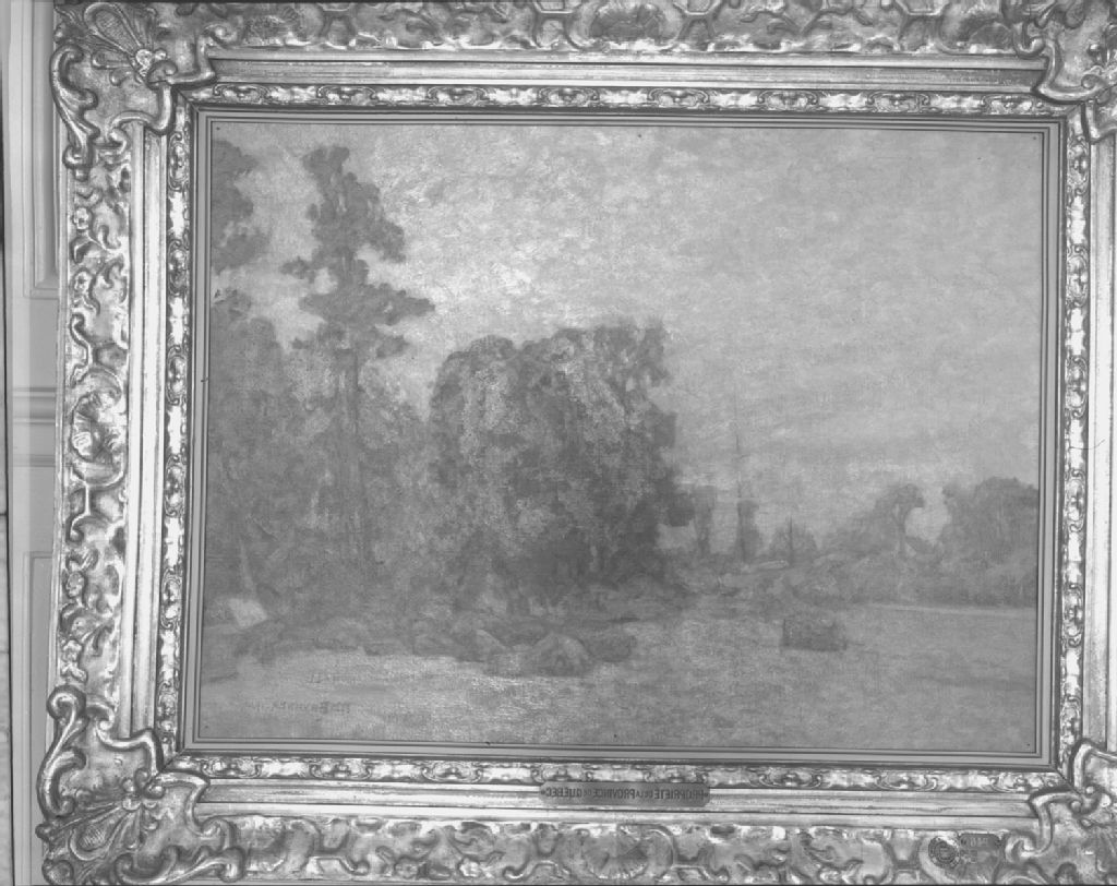 Paysage au bord de l'eau par William Brymner au Musée de la province, 1950, Archives nationales à Québec, Fonds Ministère de la Culture et des Communications, (03Q,E6,S7,SS1,D2,P82259), Neuville Bazin.