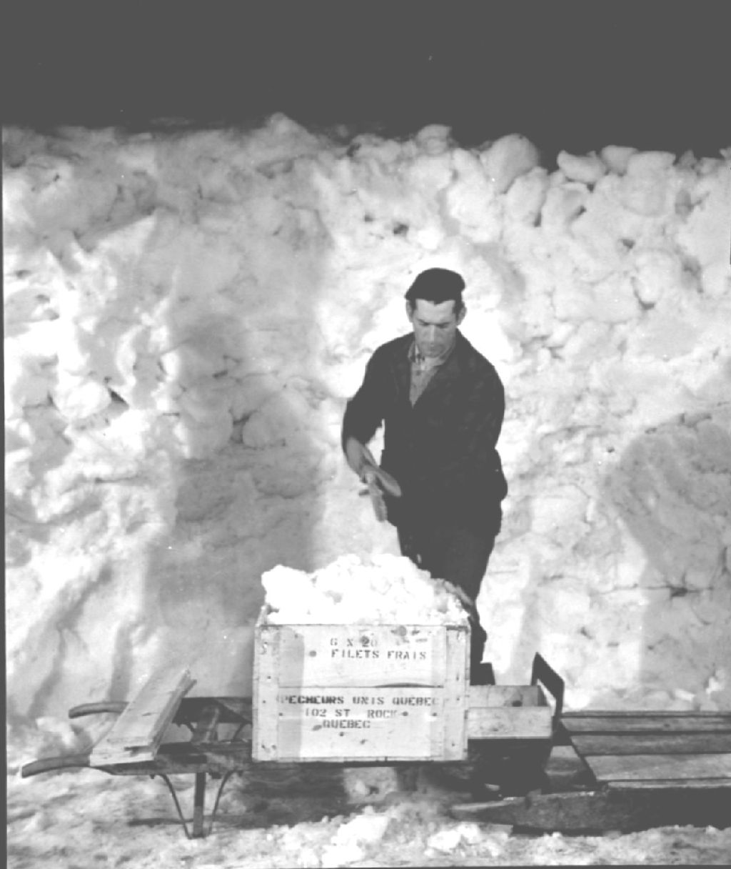 Une neigère en Gaspésie. Il s'agit d'une petite caisse remplie de glaces pour l'expédition du poisson, 1950, Archives nationales à Québec, Fonds Ministère de la Culture et des Communications, (03Q,E6,S7,SS1,D2,P82316), Gustave Bédard.