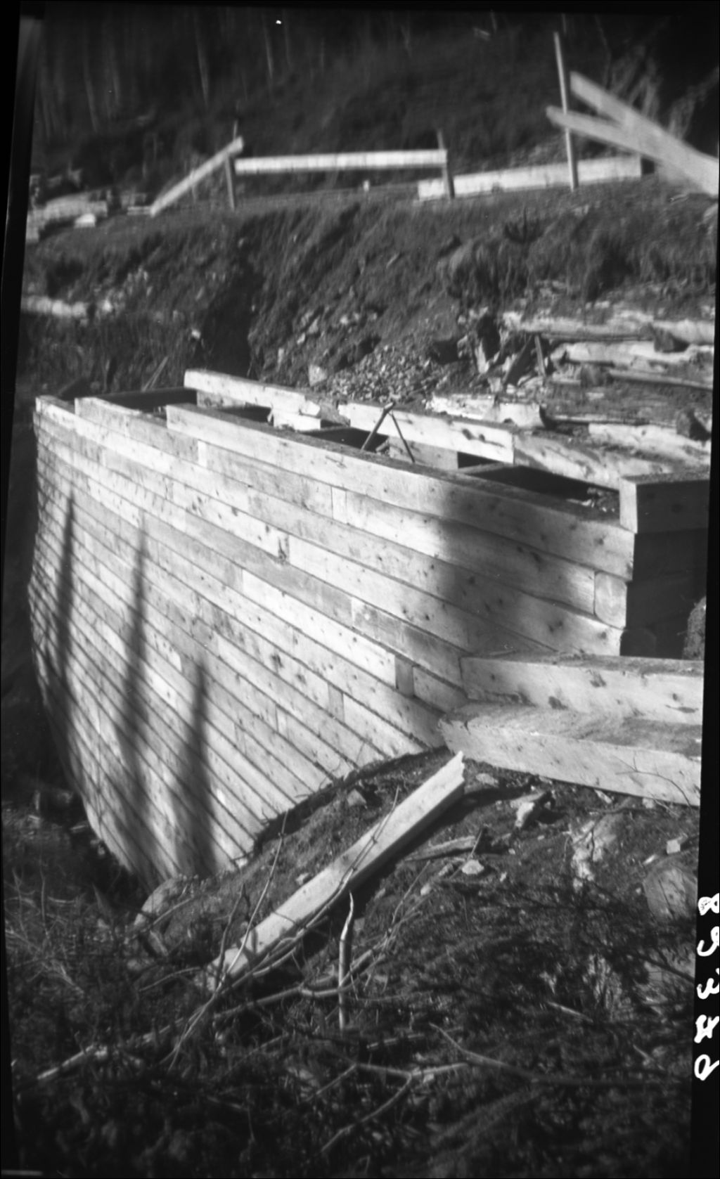 Dommages causés à un mur en bois par la pluie du 27 au 29 novembre 1950, route numéro 6-A, Rivière-au-Renard, comté de Gaspé-Sud