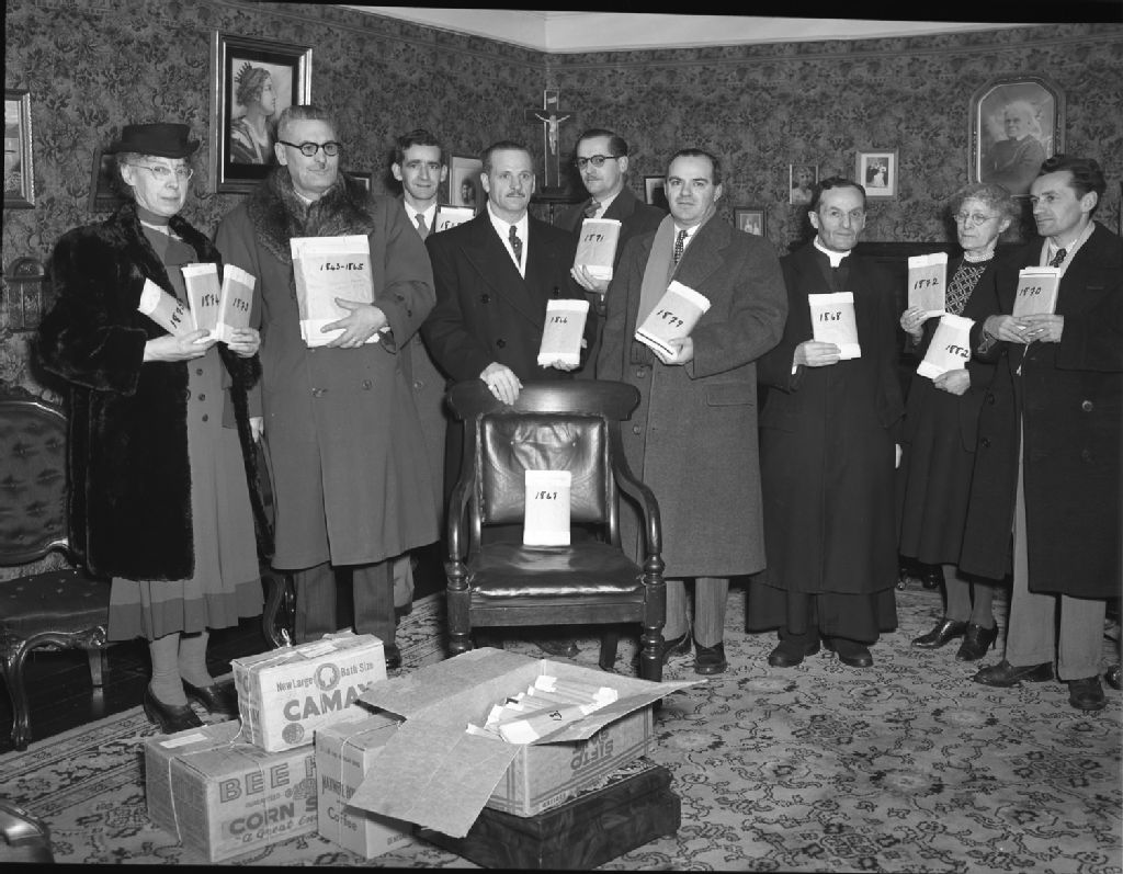 Groupe d'officiels dans le salon lors de la prise de possession des documents de Sir Thomas Chapais, derrière la chaise historique du sénateur Jean-Charles Chapais. Saint-Denis de Kamouraska, 1950, Archives nationales à Québec, Fonds Ministère de la Culture et des Communications, (03Q,E6,S7,SS1,D2,P82442), Neuville Bazin.