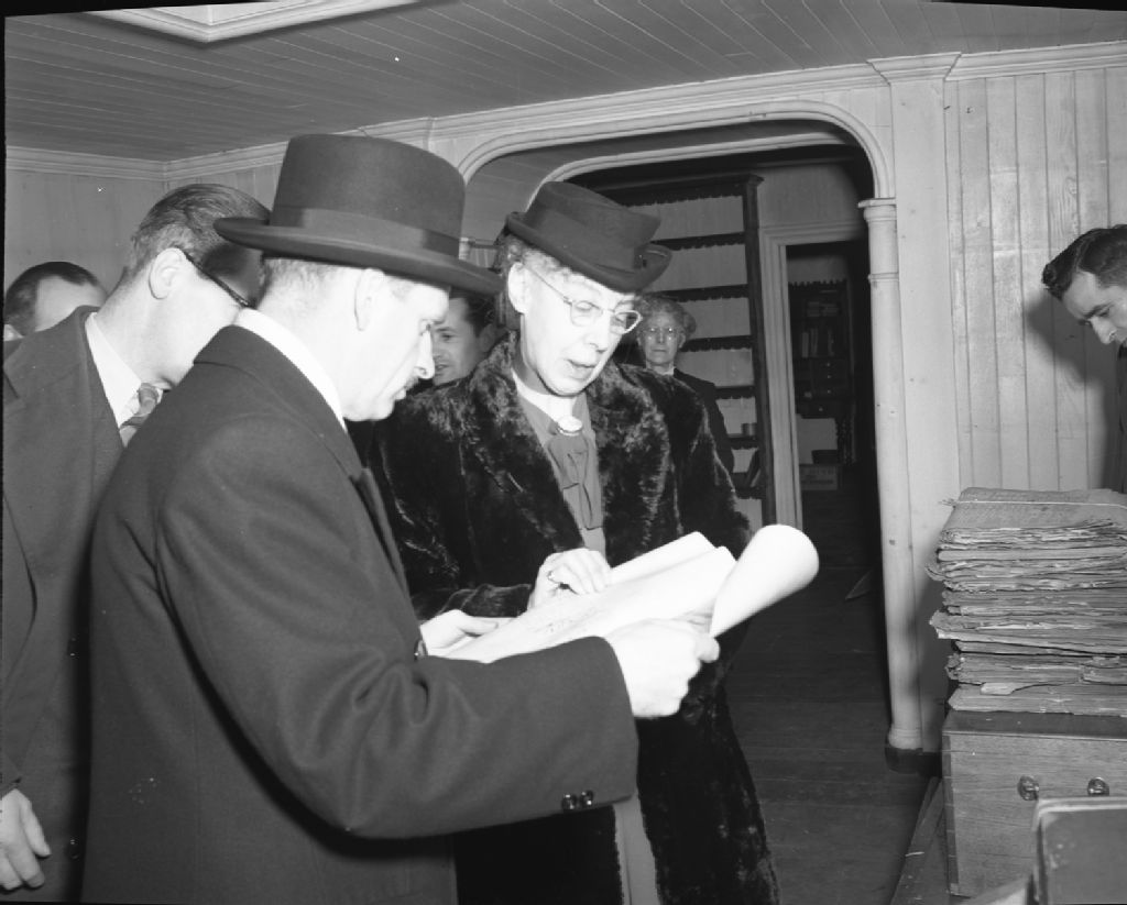 L'honorable Omer Coté et Mlle Julienne Barnard étudiant un document de Sir Thomas Chapais. Saint-Denis de Kamouraska, 1950, Archives nationales à Québec, Fonds Ministère de la Culture et des Communications, (03Q,E6,S7,SS1,D2,P82447), Neuville Bazin.