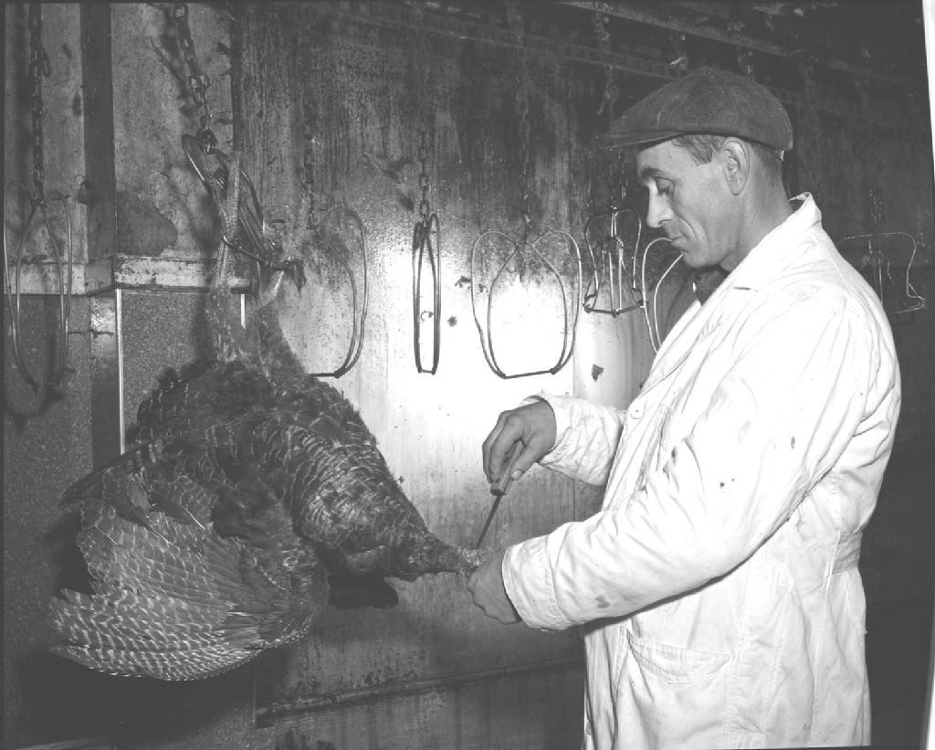 On saigne la volaille à l'abattoir coopératif de volailles à Saint-Anselme.