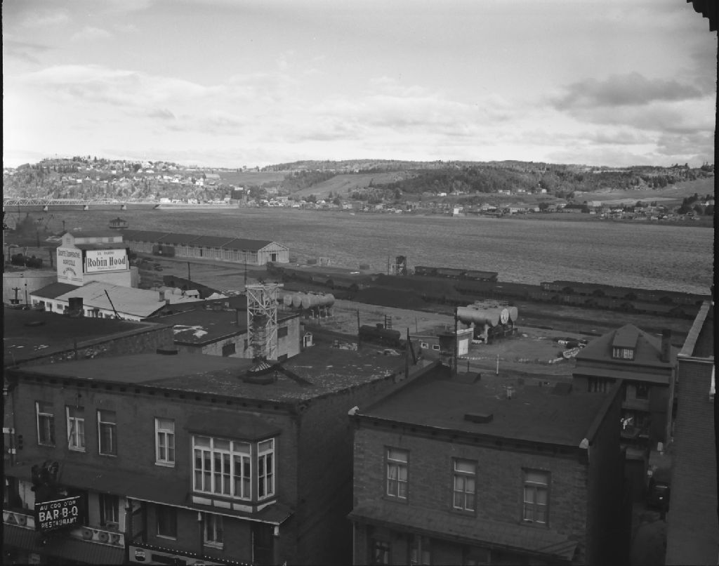 Un coin de la ville de Chicoutimi vu du toit de l'Hôtel Chicoutimi, 1950, Archives nationales à Québec, Fonds Ministère de la Culture et des Communications, (03Q,E6,S7,SS1,D2,P82592), Paul Carpentier.