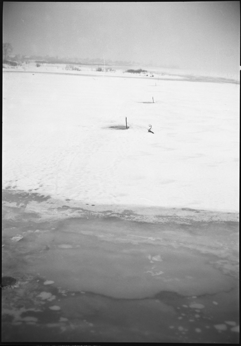 Piquets pour soutenir les filets tendus en-dessous de la glace pour la pêche commerciale. Sainte-Angèle de Laval.
