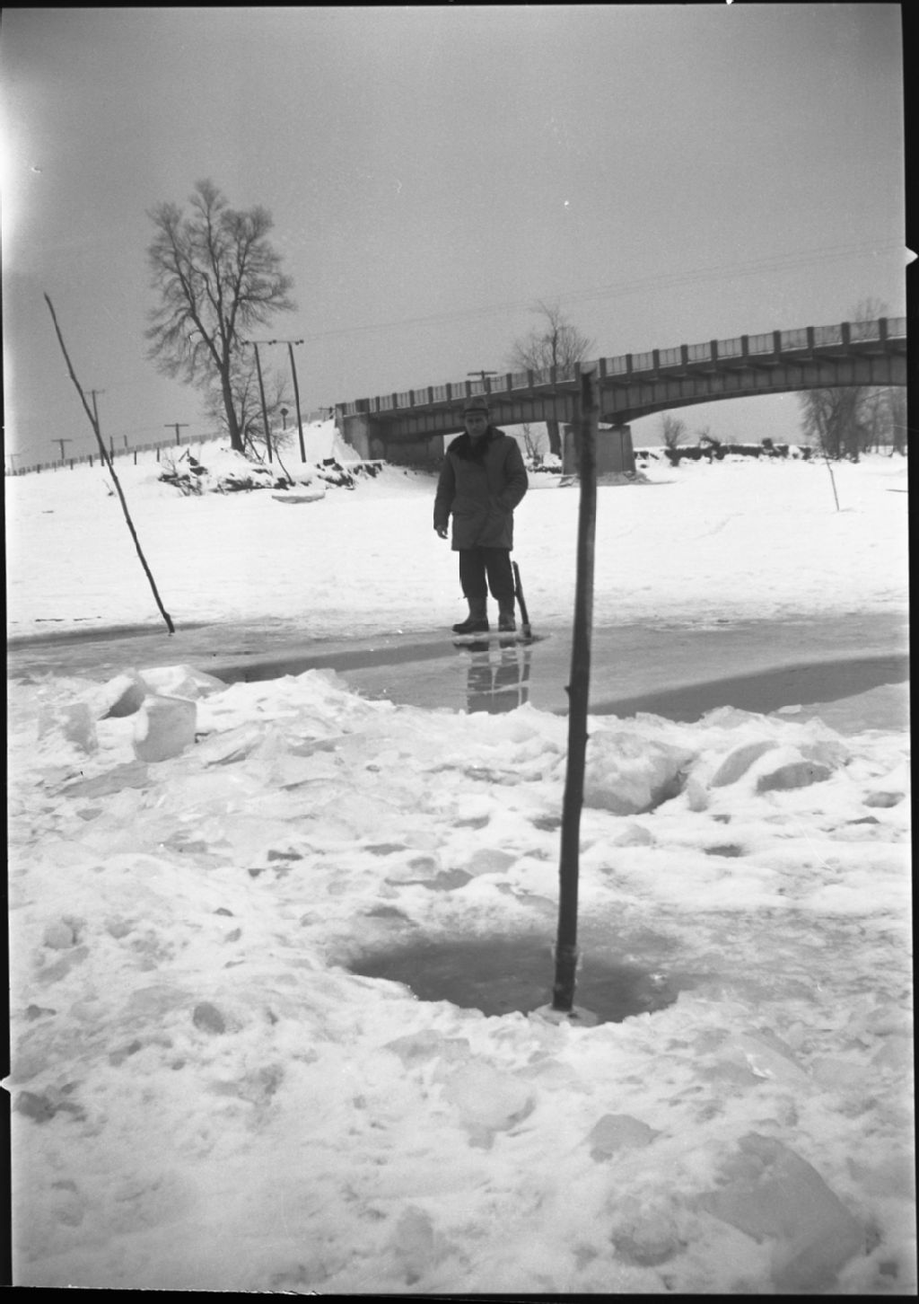 Poteau de support pour les ailes en face des verveux. Estuaire de la rivière Bécancour, comté Nicolet., 1951, Archives nationales à Québec, Fonds Ministère de la Culture et des Communications, (03Q,E6,S7,SS1,D2,P82851), Guy Gaudet.