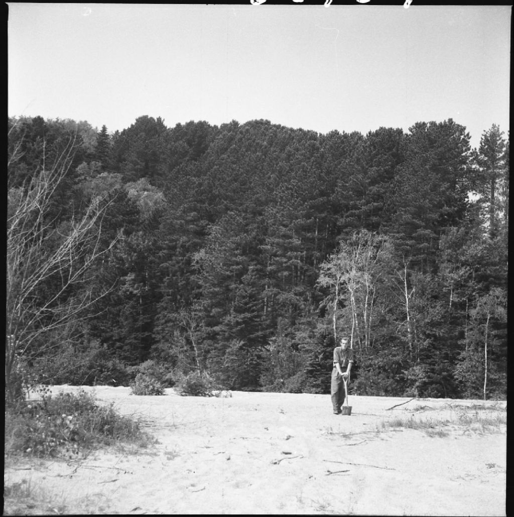 Rive de la Métabetchouan tapissée d'alluvions sableuses provenant du torrent temporaire qui a creusé une vallée à travers les berges hautes et sableuses de la rivière, Desbiens, Roberval