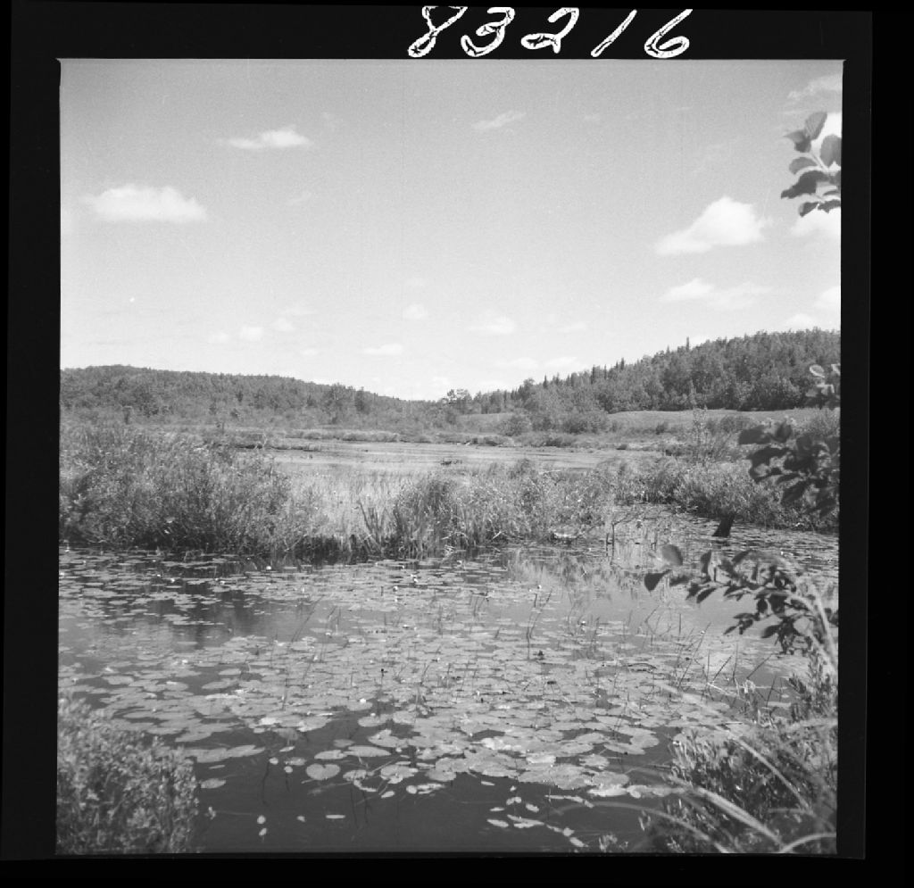 Étang marécage troite terrasse de sable entouirant le marécage et collines basses du plateau Laurentien, Lac Brûlé, Roberval