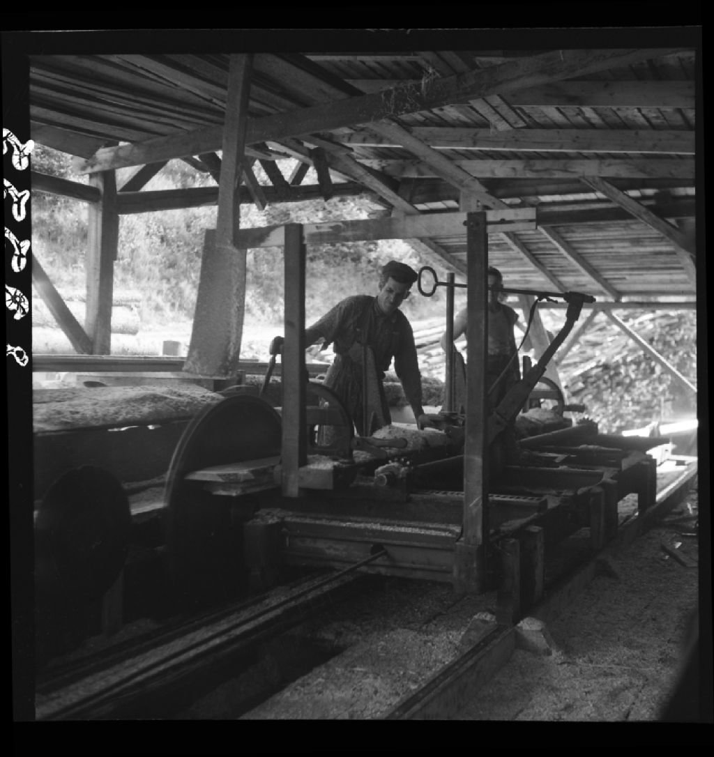Moulin à scie sur le ruisseau de Grignon intérieur du Moulin, charriot, Lac Belley, Roberval, 1950, Archives nationales à Québec, Fonds Ministère de la Culture et des Communications, (03Q,E6,S7,SS1,D2,P83222), Auguste Mailloux.