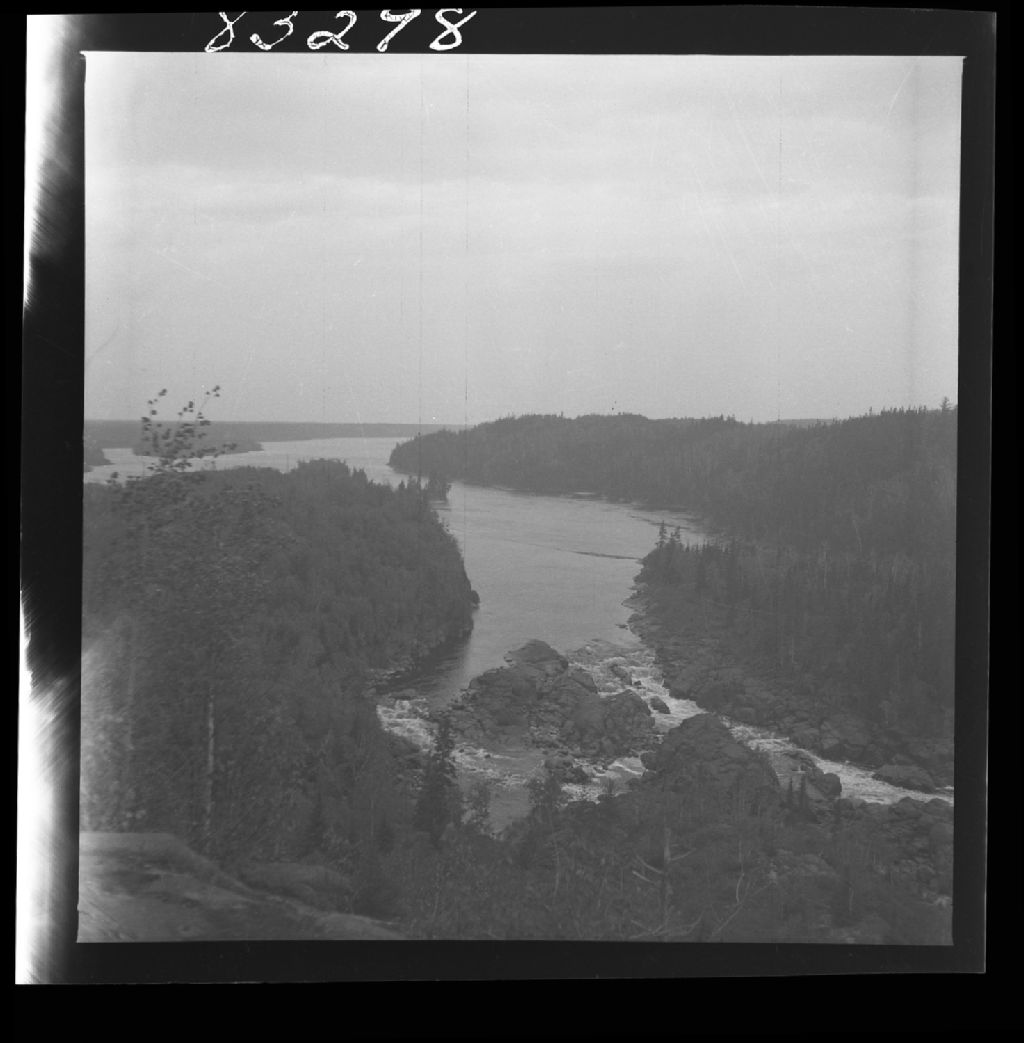 Vue d'ensemble de la branche Est de la chute au Diable. Cette branche se sépare elle-même en deux parties. On voit l'îlot rocheux qui provoque la séparation. Ici de chaque côté de la chute les rebords sont en roc solide,(Anorthosite). En amont des chutes les berges de la rivière sont constitués de sable. Honfleur, Lac Saint-Jean