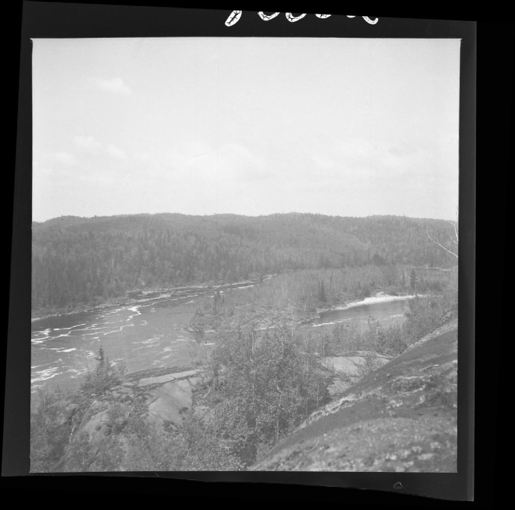 Aspect de la rivière Péribonka au pied aval de la chute au Diable. Écarts rocheux de la rivière au premier plan, polissage glaciaire., Honfleur, Lac Saint-Jean, 1950, Archives nationales à Québec, Fonds Ministère de la Culture et des Communications, (03Q,E6,S7,SS1,D2,P83302), Auguste Mailloux.