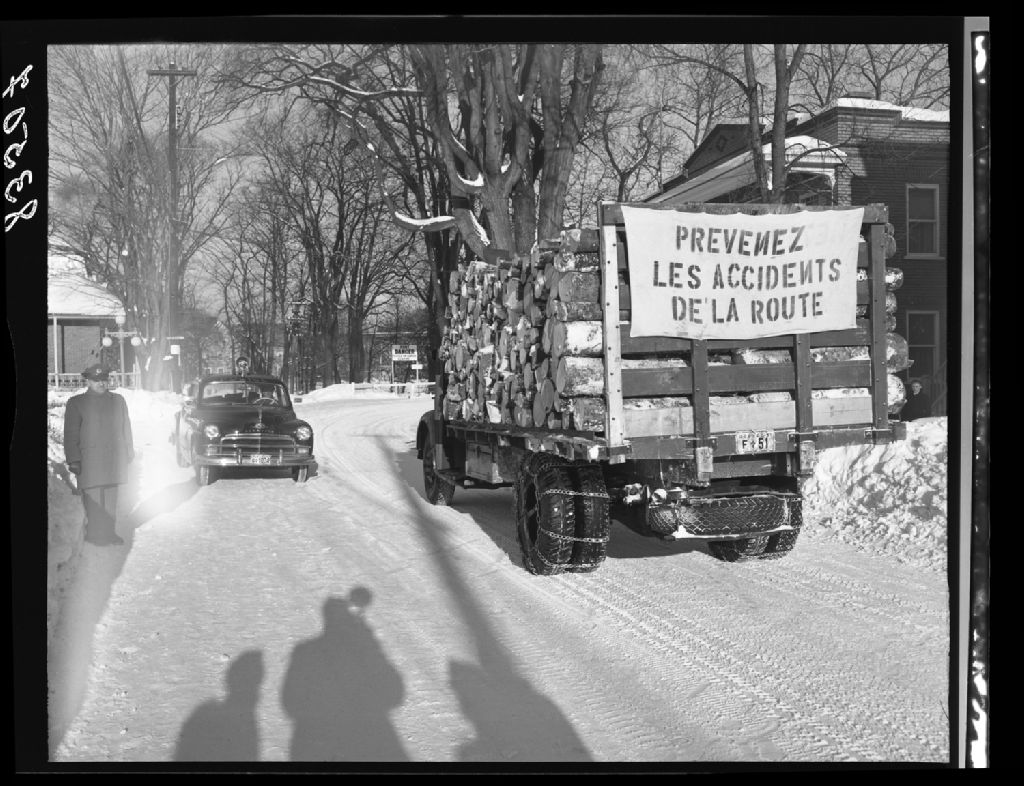 Courbe dangereuse du coté ouest du pont au dessus de la rivière Sainte-Anne traversant la municipalité de Beaupré. Camion transportant du bois à pâte au moulin de Ste-Anne Paper Company ltd. Pancarte posée par Ste-Anne Power Compagny à l'occasion de la semaine de prévention des accidents organisée par la Chambre de commerce de Beaupré, 1951, Archives nationales à Québec, Fonds Ministère de la Culture et des Communications, (03Q,E6,S7,SS1,D2,P83507), Neuville Bazin.