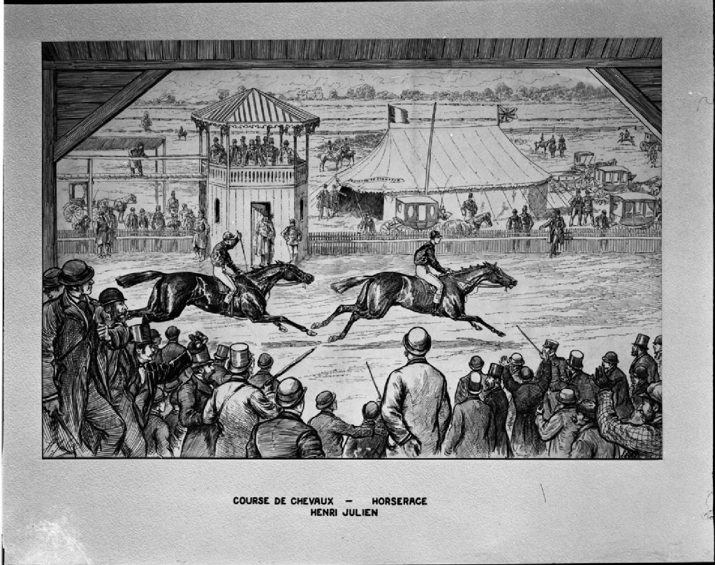 Course de chevaux par Henri Julien au Musée de la province, 1951, Archives nationales à Québec, Fonds Ministère de la Culture et des Communications, (03Q,E6,S7,SS1,D2,P83794), Neuville Bazin.
