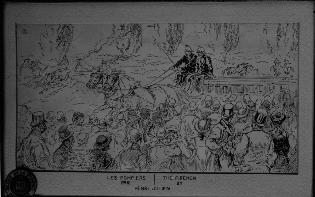 Les pompiers par Henri Julien au Musée de la province, 1951, Archives nationales à Québec, Fonds Ministère de la Culture et des Communications, (03Q,E6,S7,SS1,D2,P83812), Neuville Bazin.