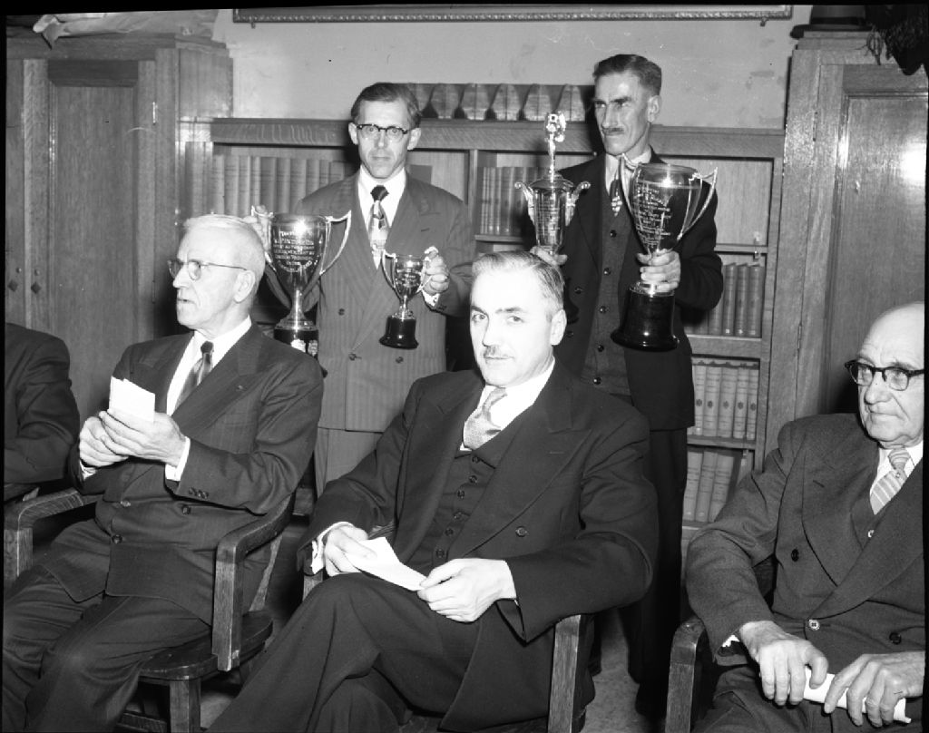 Gagnants des trophés, Émile Ayotte Saint-Aimé et L.J.Noël, Armagh, R. Camirand, notaire Cossette, honorable L. Barré, honorable P.Tardif, O.E. Milot et Romuald Belzile. Québec, 1951, Archives nationales à Québec, Fonds Ministère de la Culture et des Communications, (03Q,E6,S7,SS1,D2,P83815), J.W. Michaud.