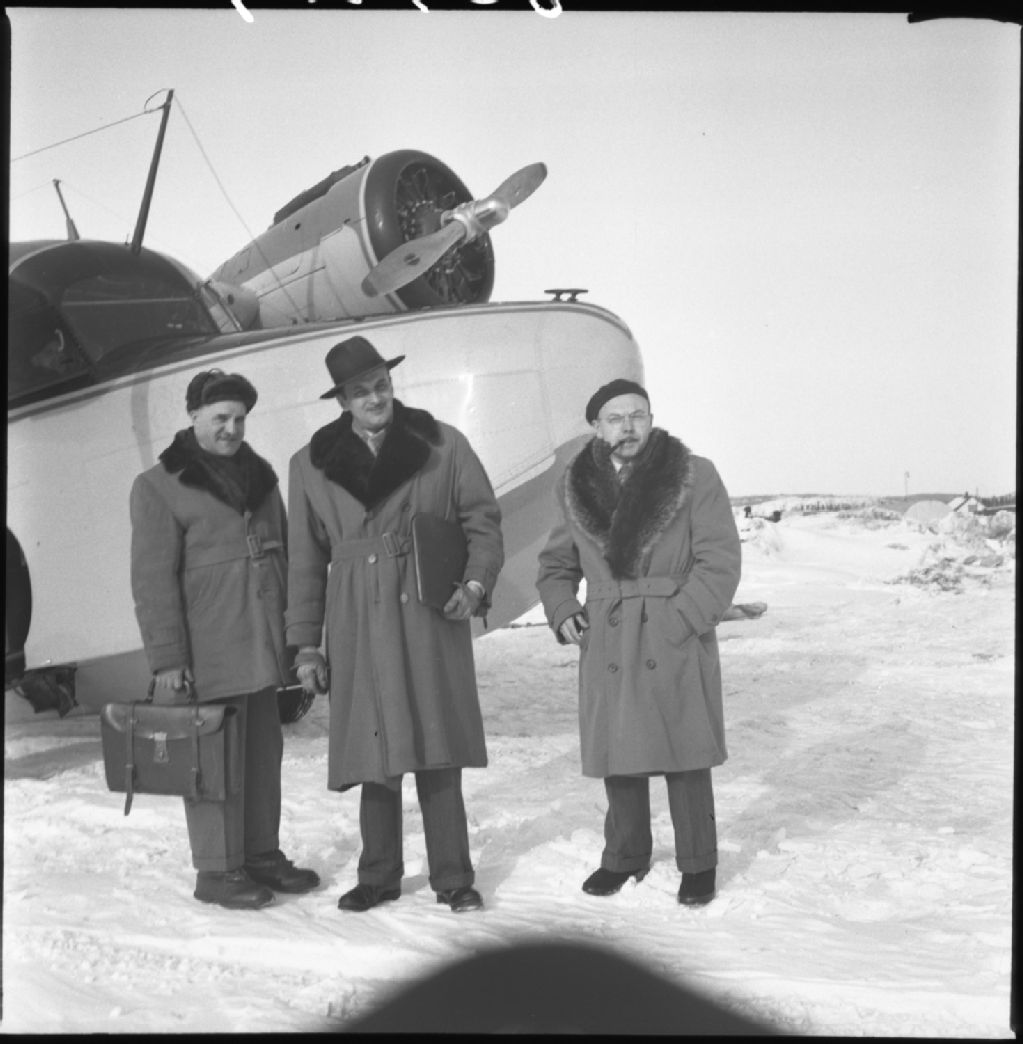 À Haute-Rive, Saguenay, de gauche à droite : Gérard Lachance, Paul-Eugène Boutin, secrétaire du Ministère de la Colonisation, Gérard Ouellet publiciste au Ministère de la Colonisation