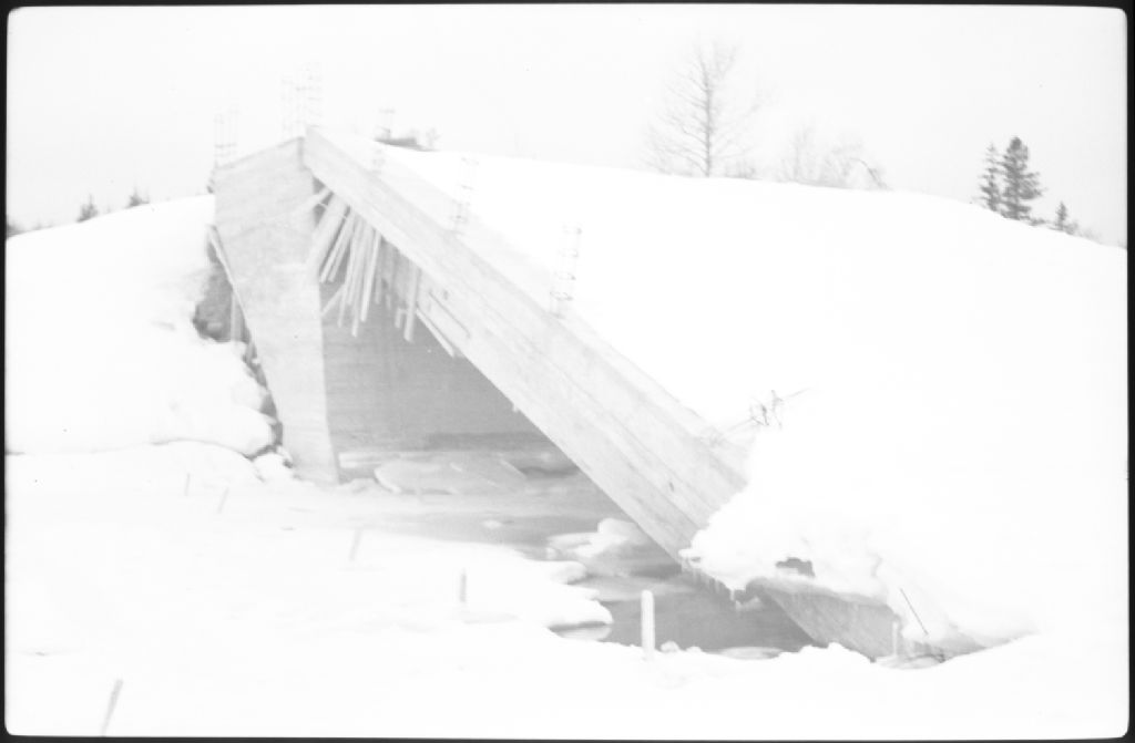 Poutres et dalles travée rive droite pont rivière Saint-Jean, canton York, comté Gaspé sud, 1951, Archives nationales à Québec, Fonds Ministère de la Culture et des Communications, (03Q,E6,S7,SS1,D2,P83937), Louis-Philippe Poudrier.