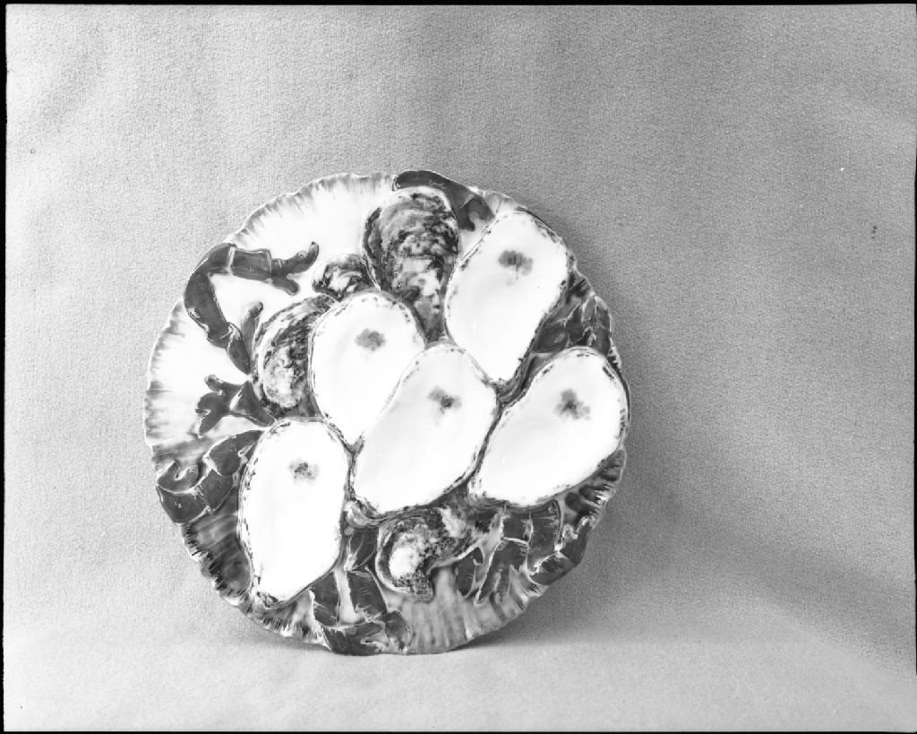 Assiette à huitres ornées chacune de cinq écailles au Musée de la province, 1951, Archives nationales à Québec, Fonds Ministère de la Culture et des Communications, (03Q,E6,S7,SS1,D2,P84467), Neuville Bazin.