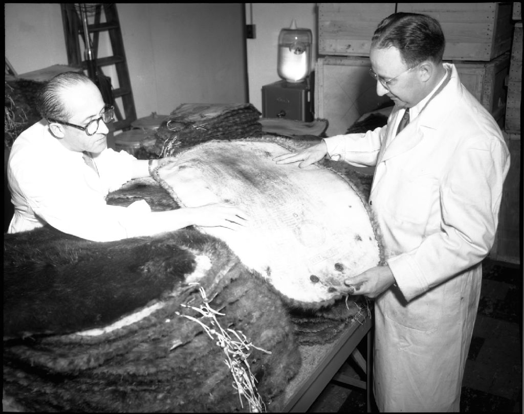 Vente de fourrures. M. Tremblay, M. Salmonovitch examinant les peaux de castor des réserves. 164 Côte d'Abraham, Québec, 1951, Archives nationales à Québec, Fonds Ministère de la Culture et des Communications, (03Q,E6,S7,SS1,D2,P84641), Neuville Bazin.