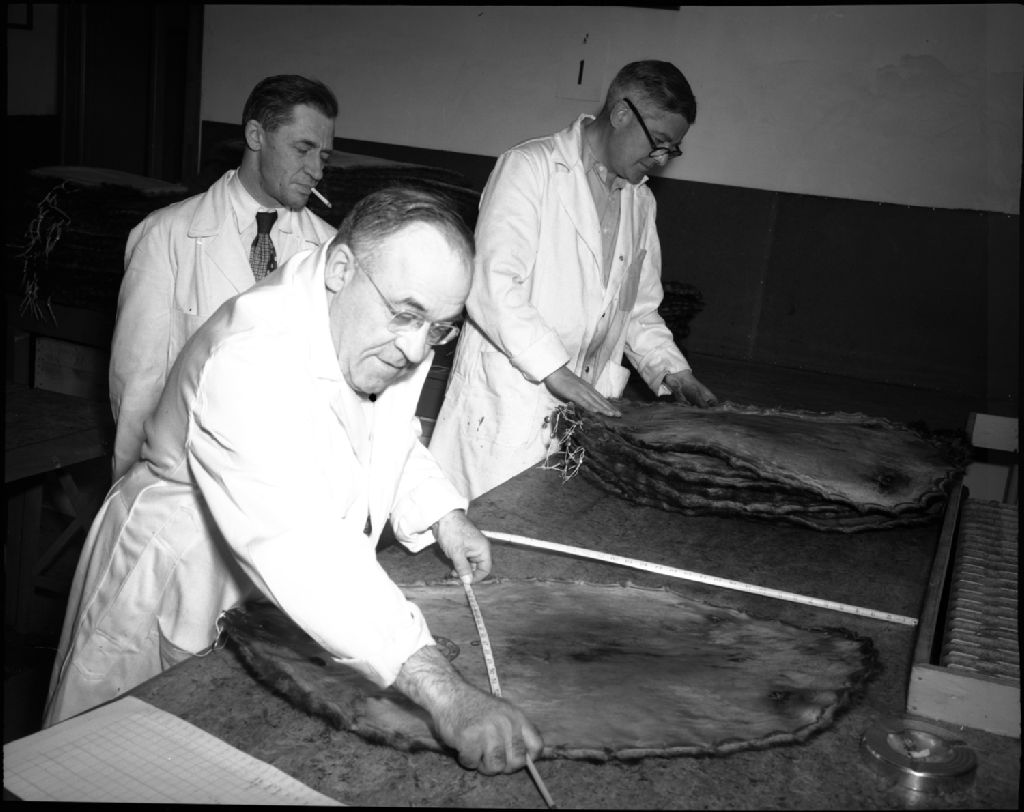Vente de fourrures. M. Jones et M. Perras, représentant Hudson Bay Co. mesurant et classant les peaux de castor des réserves. 164 Côte d'Abraham, Québec