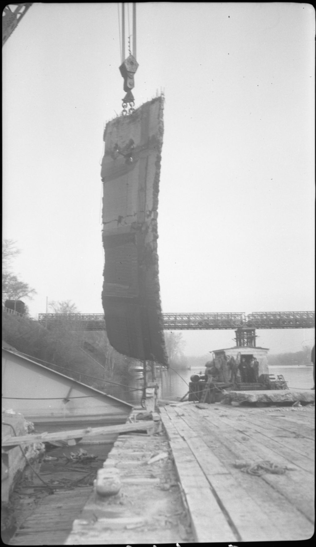 Extraction d'une section de dalle en béton dans la travée numéro 1 du pont des Trois-Rivières, 1951, Archives nationales à Québec, Fonds Ministère de la Culture et des Communications, (03Q,E6,S7,SS1,D2,P84746), Jean-Marie Reid.