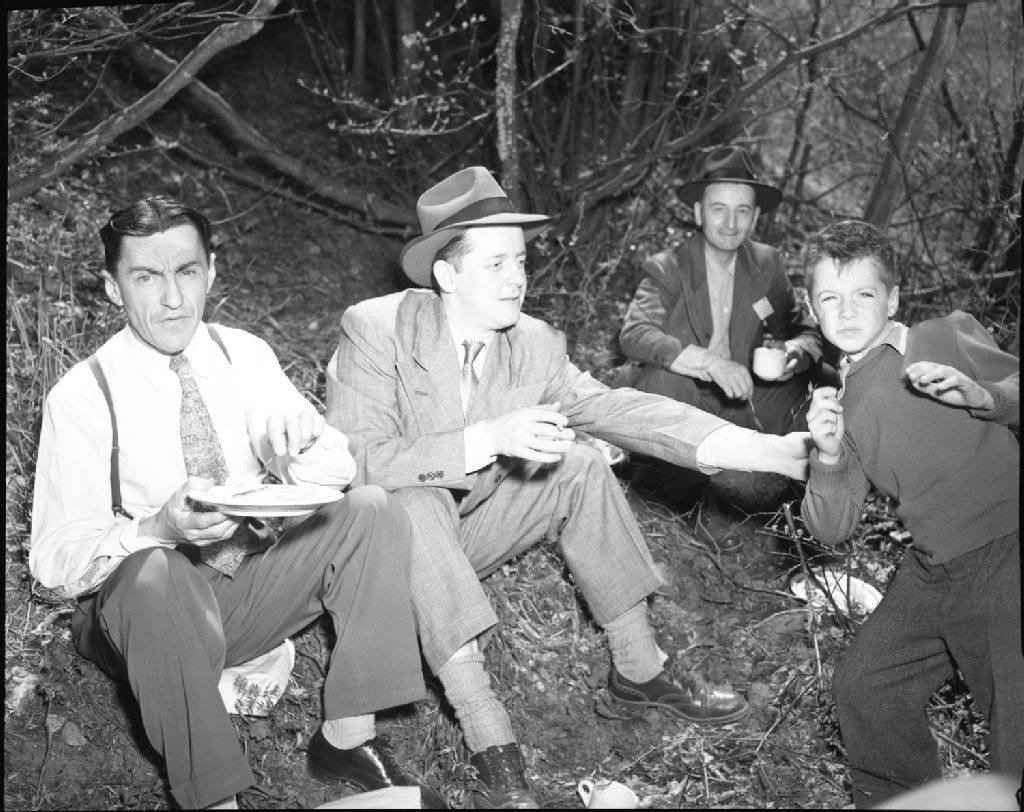 Défilé pour la protection des forêts - G. Tremblay, W. Atkins et G. Lévesque à Saint Féréol, comté de Montmorency, 1951, Archives nationales à Québec, Fonds Ministère de la Culture et des Communications, (03Q,E6,S7,SS1,D2,P84790), Neuville Bazin.