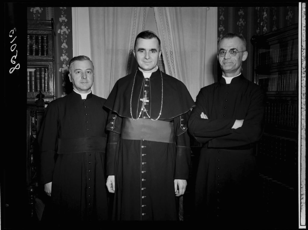 L'Abbé Léo Bouillé, aumônier du Syndicat des Instituteurs, Monseigneur Maurice Roy et monsieur le Principal de l'école normale Laval Monsieur l'abbé C. Mathieu