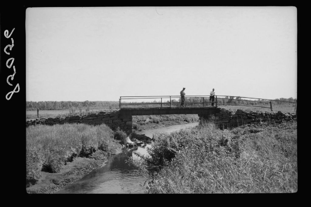 Pont de pruche sur la rivière Mawcook à Sainte-Cécile-de-Milton, comté Shefford., 1951, Archives nationales à Québec, Fonds Ministère de la Culture et des Communications, (03Q,E6,S7,SS1,D2,P85056), Edgar Gilbert.
