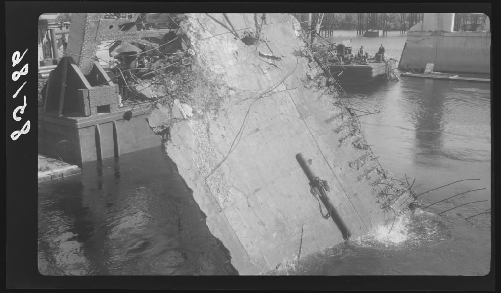 Extraction d'une section d'une dalle en béton qui était demeurée en position verticale près du pilier numéro 1 lors de la chute du pont Duplessis à Trois-Rivières