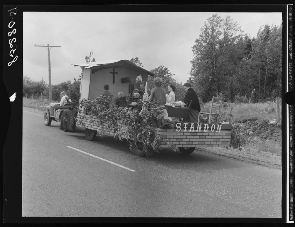 Célébration de la Saint-Jean-Baptiste parade de chars allégoriques, Sainte-Claire, comté Dorchester, 1951, Archives nationales à Québec, Fonds Ministère de la Culture et des Communications, (03Q,E6,S7,SS1,D2,P85280), J.W.Michaud.