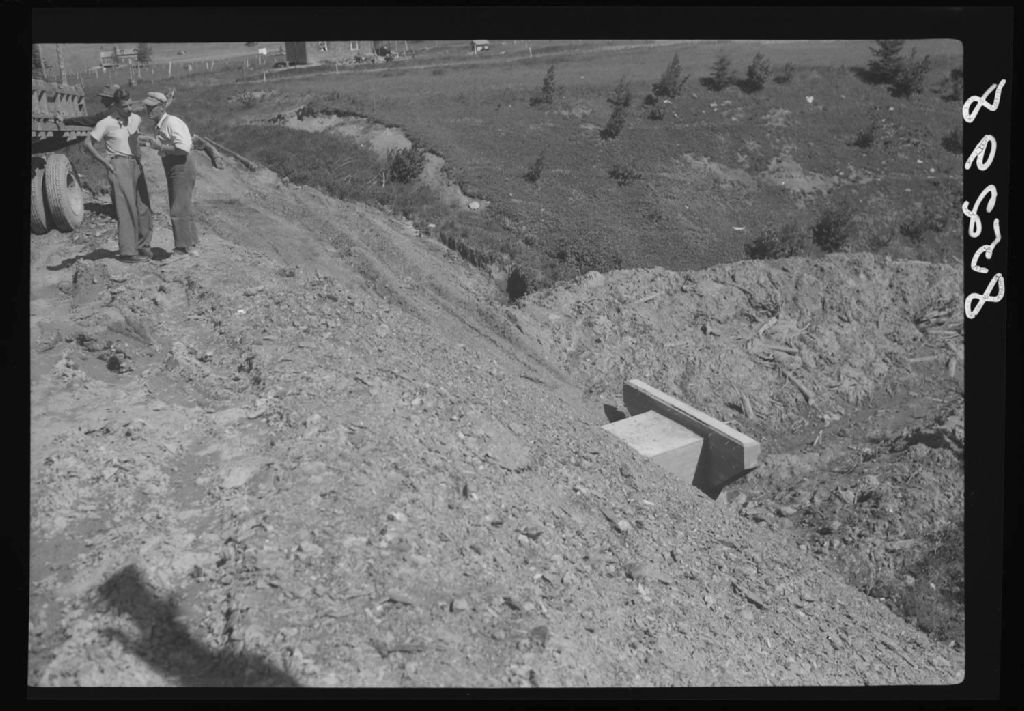 Construction d'un ponceau en béton de 6 X 4 X 20 pieds à Saint-Jean-Baptiste-Vianney, comté de Matapédia, 1951, Archives nationales à Québec, Fonds Ministère de la Culture et des Communications, (03Q,E6,S7,SS1,D2,P85298), Roméo Savary.