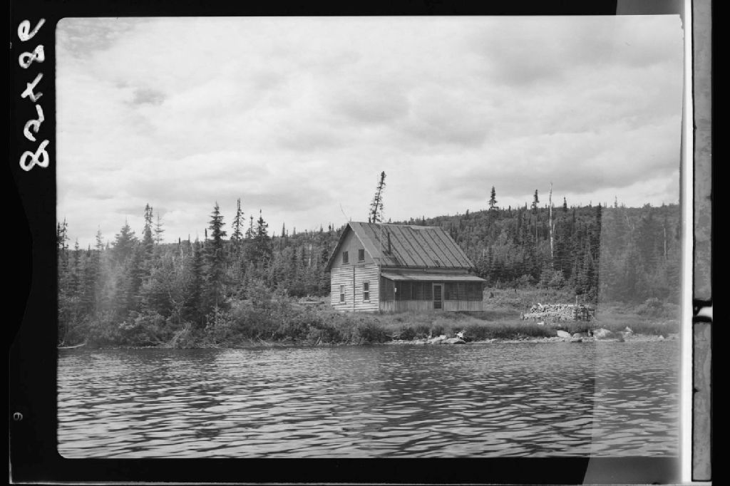 Camps du Service de la Protection, ministère des Terres et Forêts. Ce camp a servi pour la première centrale téléphonique à Chibougamau de 1938 à 1939. Lac aux Dorés. Chibougamau.