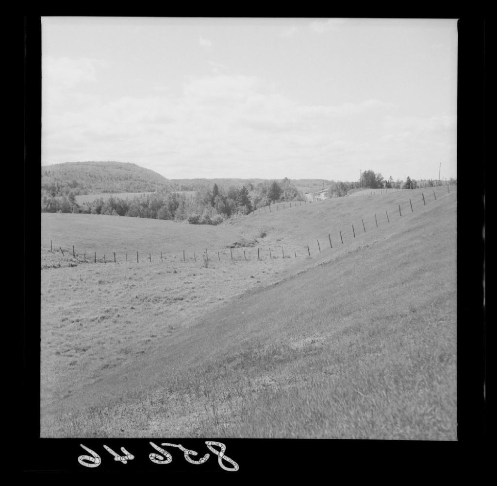 Dépression autrefois complètement fermée. Aujourd'hui un rigolet égoutte ce bassin que remplissait les eaux. Tout autour le sable ou l'argile Champlain. Saint-Jérôme, Métabetchouan, 1951, Archives nationales à Québec, Fonds Ministère de la Culture et des Communications, (03Q,E6,S7,SS1,D2,P85646), Auguste Mailloux.