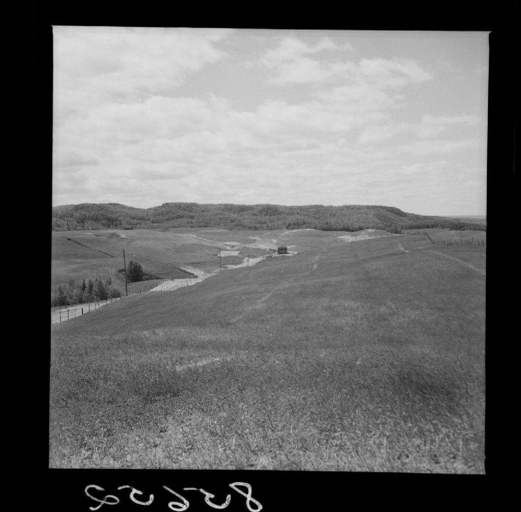 Plaine d'âge Champlain vallonnée sablonneuse. À l'arrière plan escarpement de faille, plateau Laurentien, le bouclier du géologue, matériel igné. Pays en partie disséqué par les cours d'eau et ondulations d'autre part, dû à des accumulations des éoliennes. Desbiens, Lac Saint-Jean