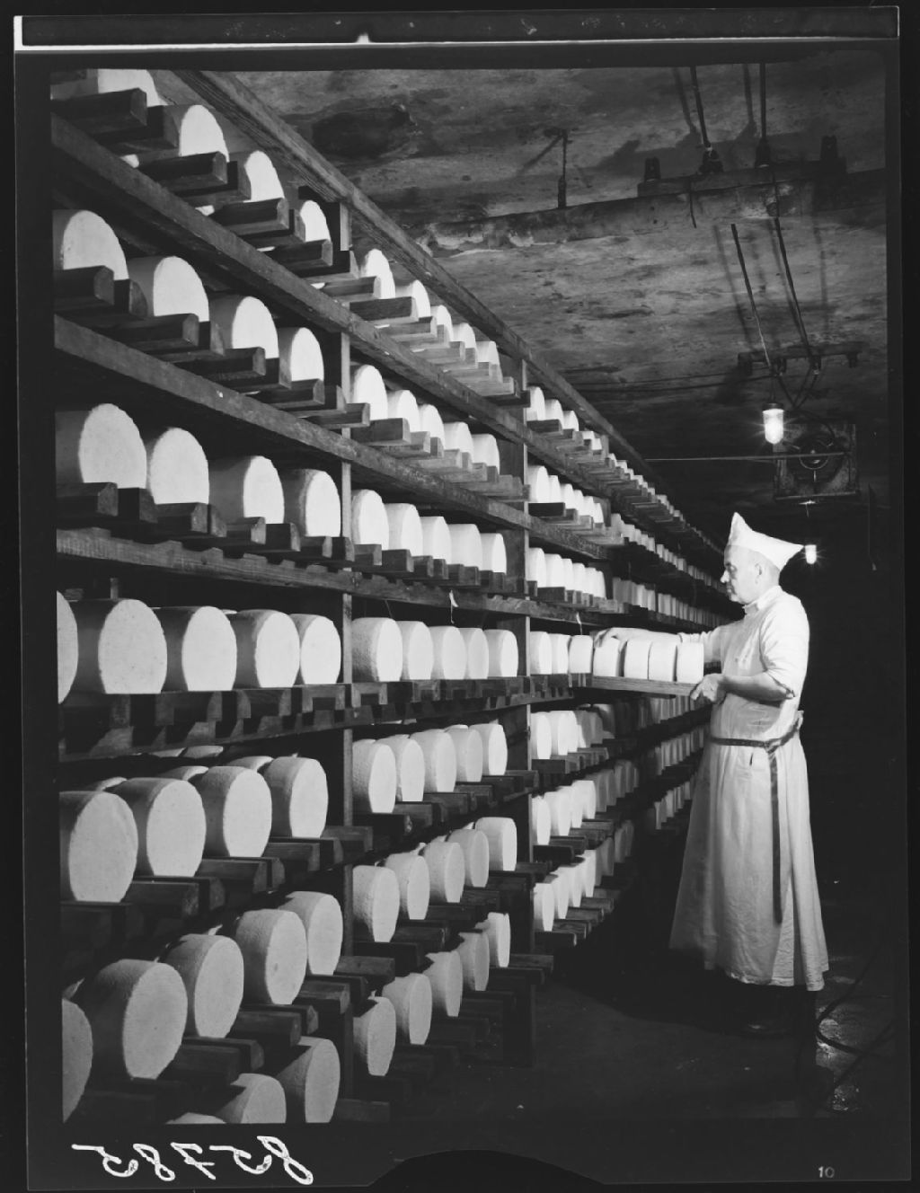 Chambre de maturation du fromage Ermite à Saint-Benoît-du-Lac., 1951, Archives nationales à Québec, Fonds Ministère de la Culture et des Communications, (03Q,E6,S7,SS1,D2,P85785), Omer Beaudoin.