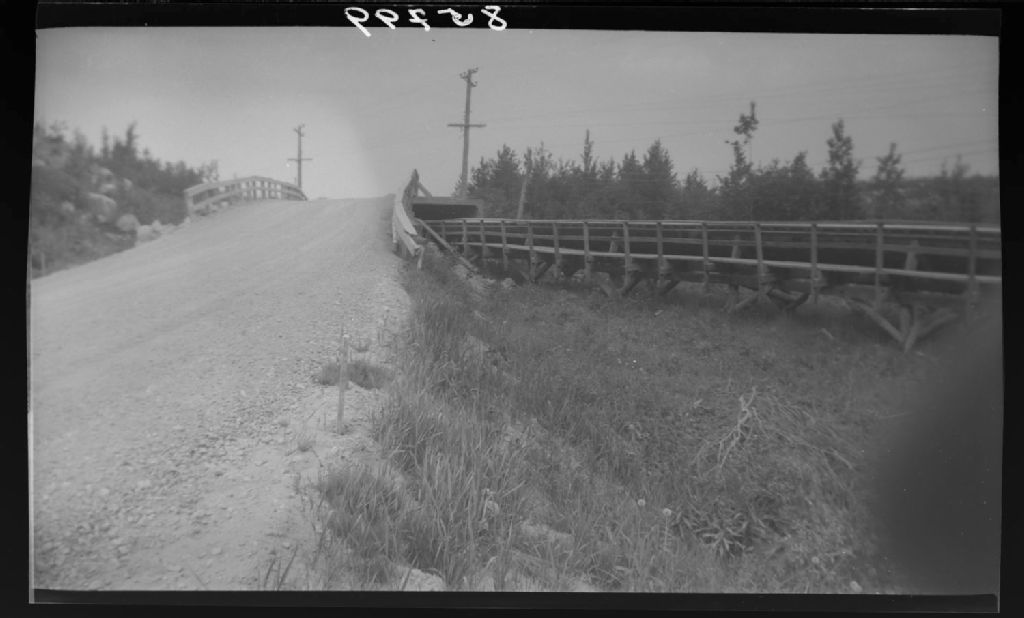 Ponceau en bois sur la route 15 entre Manicouagan et Baie-Comeau. Quebec North Shore & Paper Co., comté de Saguenay, 1951, Archives nationales à Québec, Fonds Ministère de la Culture et des Communications, (03Q,E6,S7,SS1,D2,P85799), Jules Carbonneau.