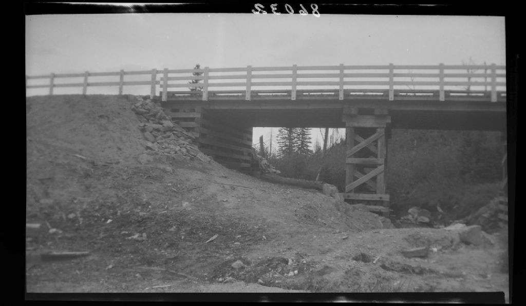 Viaduc en bois sur la petite rivière Bersimis sur la route 15. Canton Betsiamites, comté de Saguenay, 1951, Archives nationales à Québec, Fonds Ministère de la Culture et des Communications, (03Q,E6,S7,SS1,D2,P86032), Jules Carbonneau.