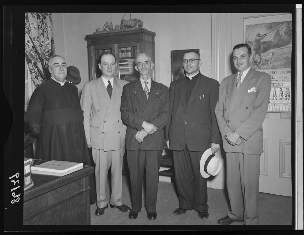 Monsieur Philippe Angers, défricheur, de Landrienne, visite l'Honorable Joseph-Damase Bégin. De gauche à droite: Monsieur l'Abbé Aurthur Fortier, sous-ministre adjoint de la Colonisation, l'Honorable Joseph-Damase Bégin, Ministre de la Colonisation, monsieur Philippe Angers, le chanonie Émile Couture, curé de Taschereau et missionnaire colonisateur pour l'Abitibi, et monsieur Paul-Eugène Boutin, chef du service du Placement des défricheurs à Québec.