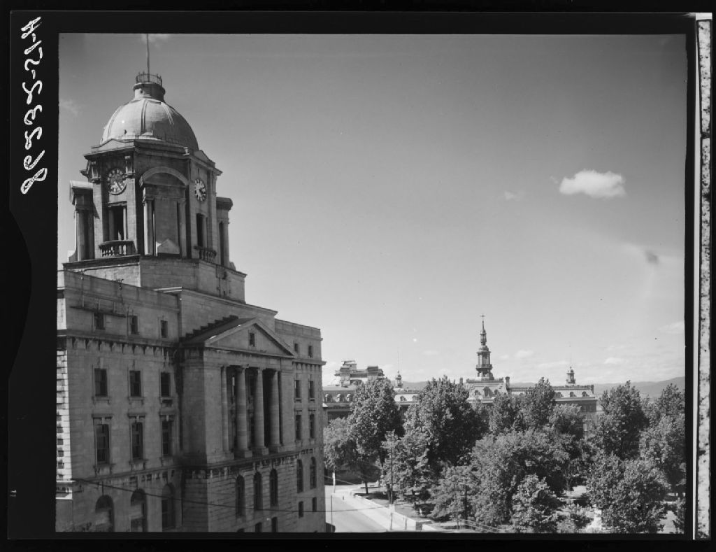 Bureau de poste de la haute-ville à l'avant-plan et l'université Laval à l'arrière-plan, Québec
