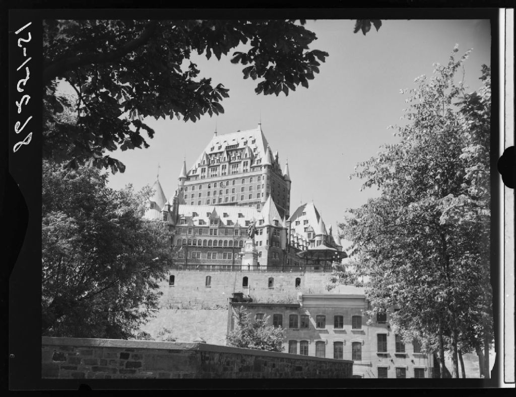 Le Château Frontenac vu du parc Montmorency, Québec, 1951, Archives nationales à Québec, Fonds Ministère de la Culture et des Communications, (03Q,E6,S7,SS1,D2,P86251), Neuville Bazin.