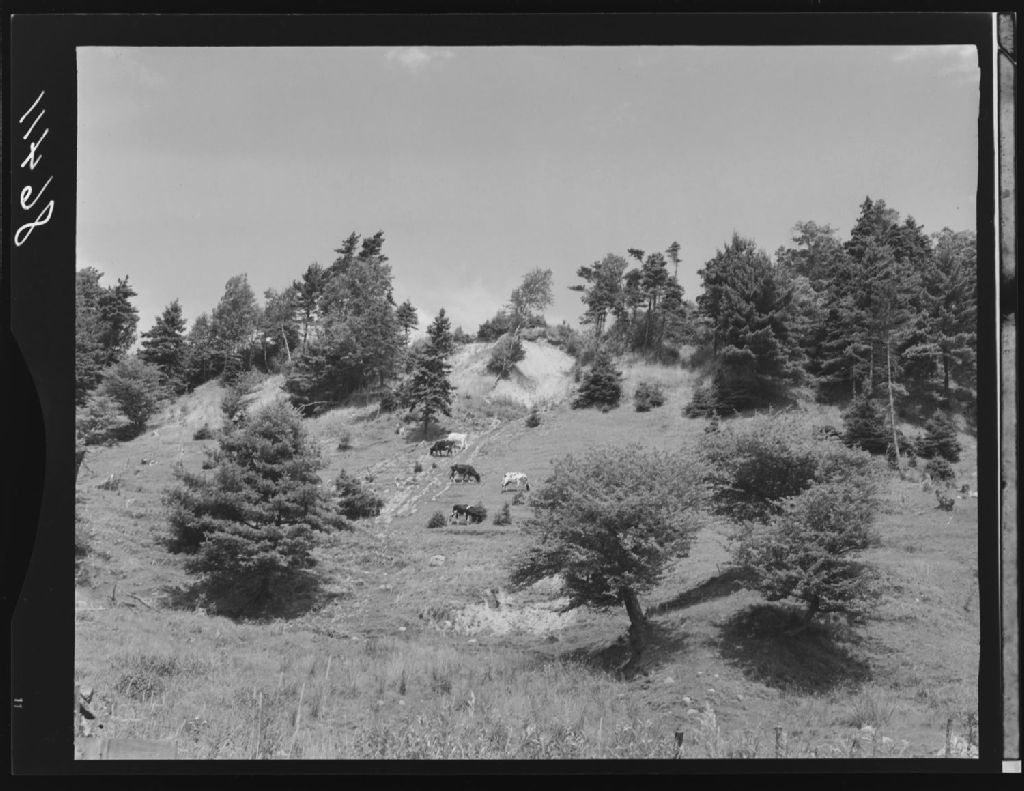 Érosion et pâturage. Portneuf, 1951, Archives nationales à Québec, Fonds Ministère de la Culture et des Communications, (03Q,E6,S7,SS1,D2,P86411), J.W.Michaud.