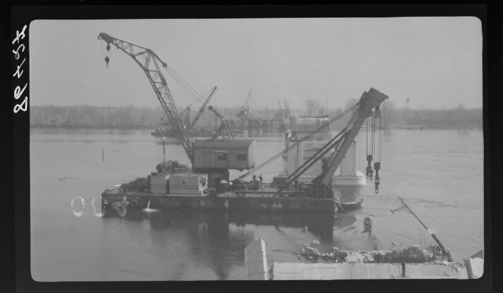 Grue Scarboro installée dans la travée numéro 2 du pont Duplessis à Trois-Rivières, 1951, Archives nationales à Québec, Fonds Ministère de la Culture et des Communications, (03Q,E6,S7,SS1,D2,P86427), Jean-Marie Reid.