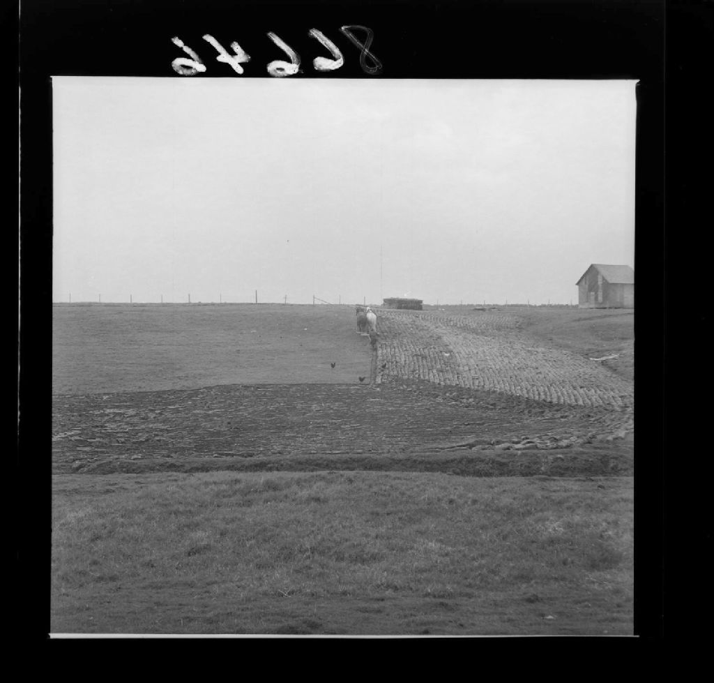 Les labours dans le sens de la pente. Méthode de labourage favorisant l'entraînement des particules terreuses du haut de la pente jusqu'à ses pieds. Particules véhiculées au fond des sillons par des ruisselets à la suite des pluies qui empruntent ces tracés artificiels comme chenaux. Sainte-Lucie d'Albanel, 1951, Archives nationales à Québec, Fonds Ministère de la Culture et des Communications, (03Q,E6,S7,SS1,D2,P86646), Auguste Mailloux.