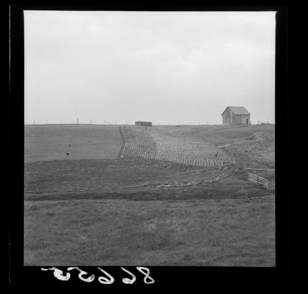 Labour dans le sens des pentes. Deux photographies, l'une complète l'autre bâtiments de ferme terre forte au pied de la pente. Rainure fluviale. Maigre cours d'eau. Sainte-Lucie-d'Albanel